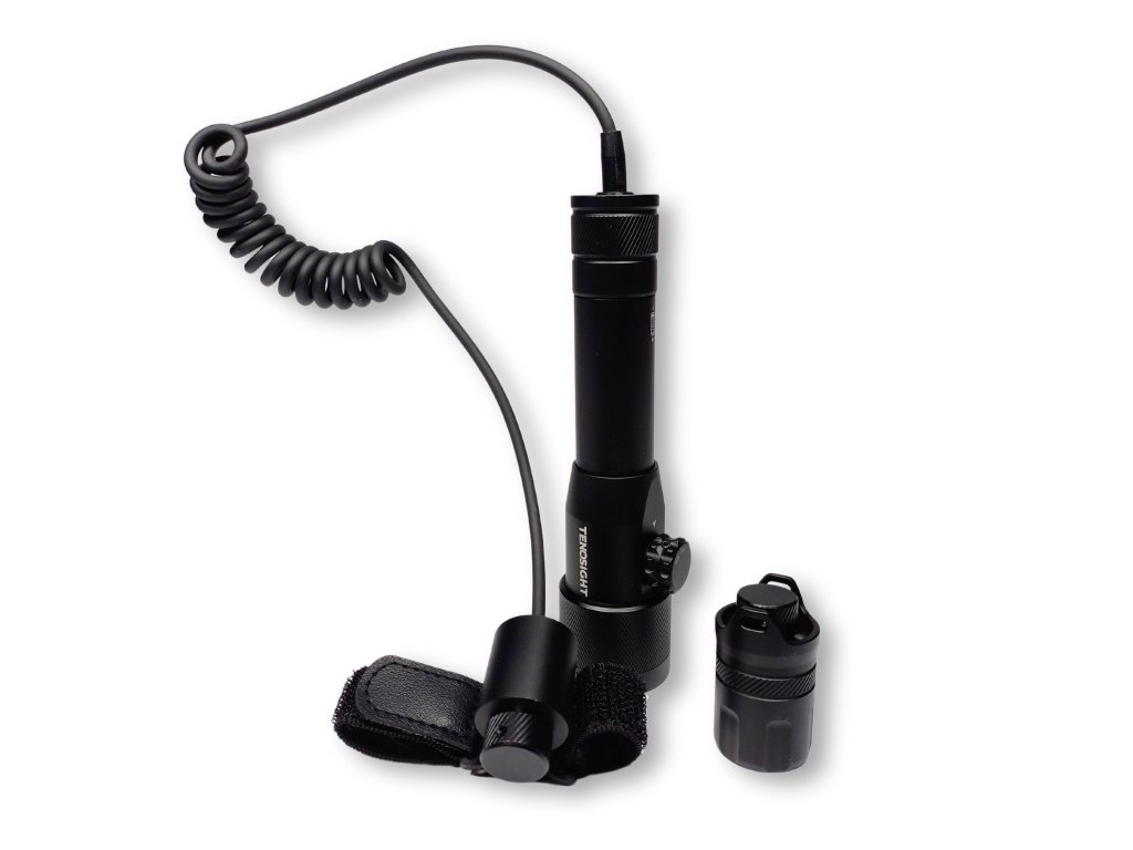Steuerung der Zusatzbeleuchtung TenoSight L-940 Laser und L-DUAL 940 + 850 nm Laser direkt an Ihren Fingerspitzen! Sehr einfach zu bedienen, indem Sie den Batteriefachdeckel aufschrauben und das Gerät mit einem Riemen mit rutschfesten Streifen an der Waffe befestigen. Das strapazierfähige Kabel hat die optimale ausziehbare Länge.