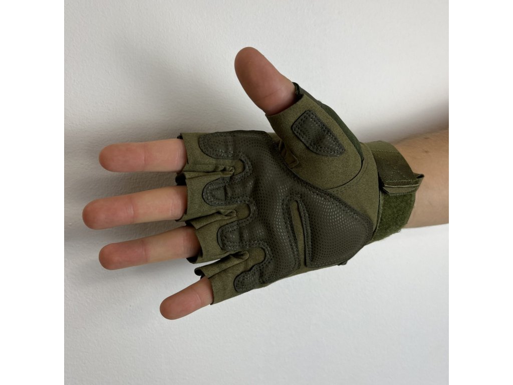 Fingerlose taktische Handschuhe HF 1 Olive Die taktischen fingerlosen Handschuhe HF 1 Olive bestehen aus hochfestem, verschleißfestem Synthetikgewebe und sind für den langfristigen Einsatz unter schwierigen Bedingungen ausgelegt. Harte Polymereinsätze auf der Rückseite schützen vor Stößen, Kratzern und Reibung. Die Passform ist mit einem Verschluss am Handgelenk verstellbar. Die Innenseite der Handfläche ist mit einer verstärkten Beschichtung versehen, um Gegenstände sicher greifen zu können. Die anatomische Form reduziert die Belastung der Gelenke bei aktiver Nutzung. Das Modell eignet sich für die Arbeit mit Waffen, Ausrüstung und Werkzeugen. Ideal für Tourismus und taktisches Training. Marke: Partizan Tactical Farbe: Olive Größe: M, L, XL