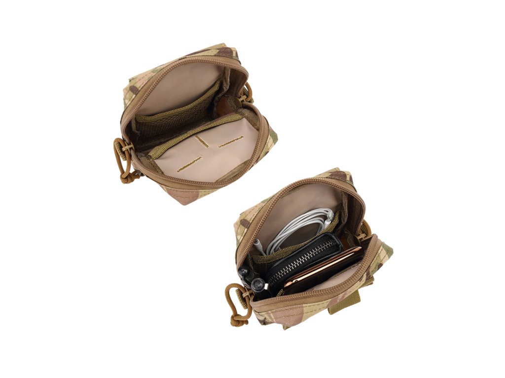 Die Vorderseite der Tasche ist mit Klettverschluss versehen, die Rückseite mit Elementen des MOLLE-Systems.
