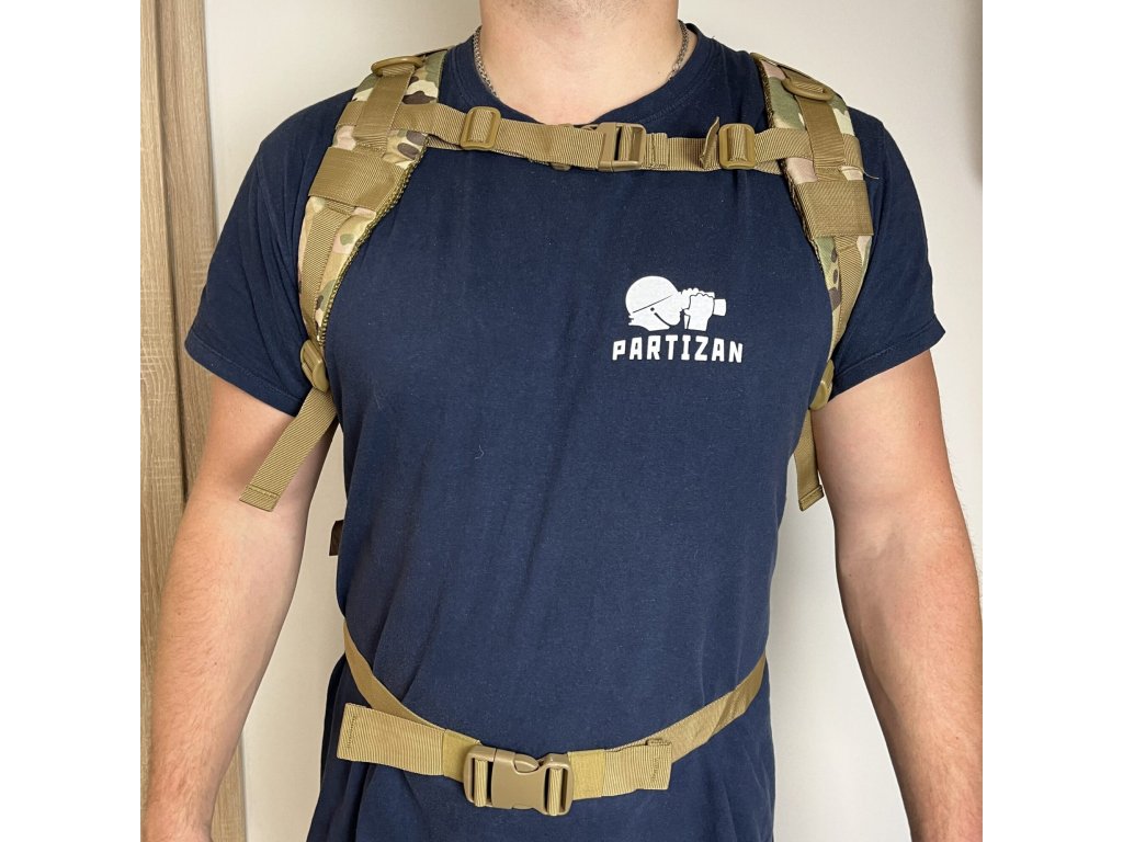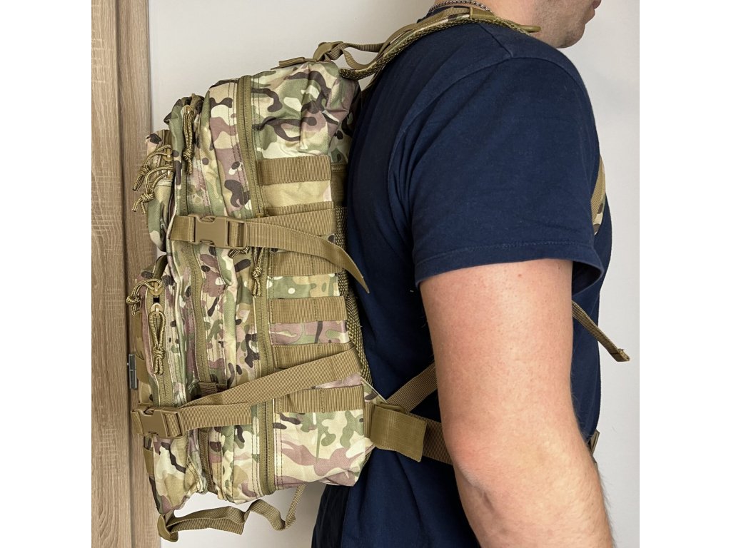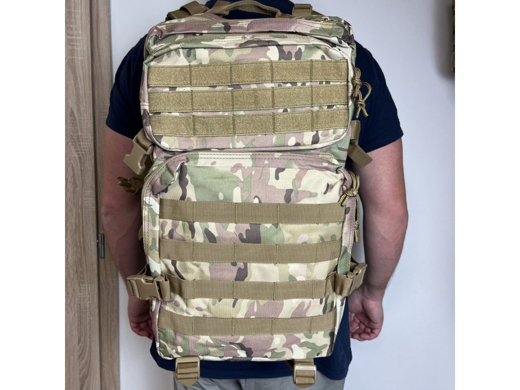 Taktischer Rucksack 40 l mit Molle-System (BPT9-40) Molle Camo Dieser taktische Rucksack mit 40 l Fassungsvermögen verfügt über ein Molle-System auf der Vorderseite. Der Rucksack hat außerdem zwei große Hauptfächer und zwei Außentaschen. Alle Fächer und Taschen sind mit robusten und zuverlässigen Reißverschlüssen ausgestattet. An der oberen Außentasche verfügt das Molle-System über einen Klettverschluss, an dem Sie einen Aufnäher oder eine zusätzliche kleine Tasche befestigen können. Die untere Außentasche verfügt ebenfalls über ein Molle-System. An der Oberseite des Rucksacks befindet sich eine Öffnung für das Trinksystem und auf der Rückseite ein verstecktes Klettfach. Die Rückseite des Rucksacks ist ergonomisch geformt und weich. Mit den seitlichen Kompressionsriemen lässt sich das Volumen des Rucksacks anpassen. Klassisches, zeitloses Design. Material: 600D Oxford Größe: 48 x 30 x 28 cm Gewicht: 1500 g Farbe: Camo Lieferumfang: 1x Tactical Rucksack 40 L mit Molle-System (BPT9-40) Molle Camo