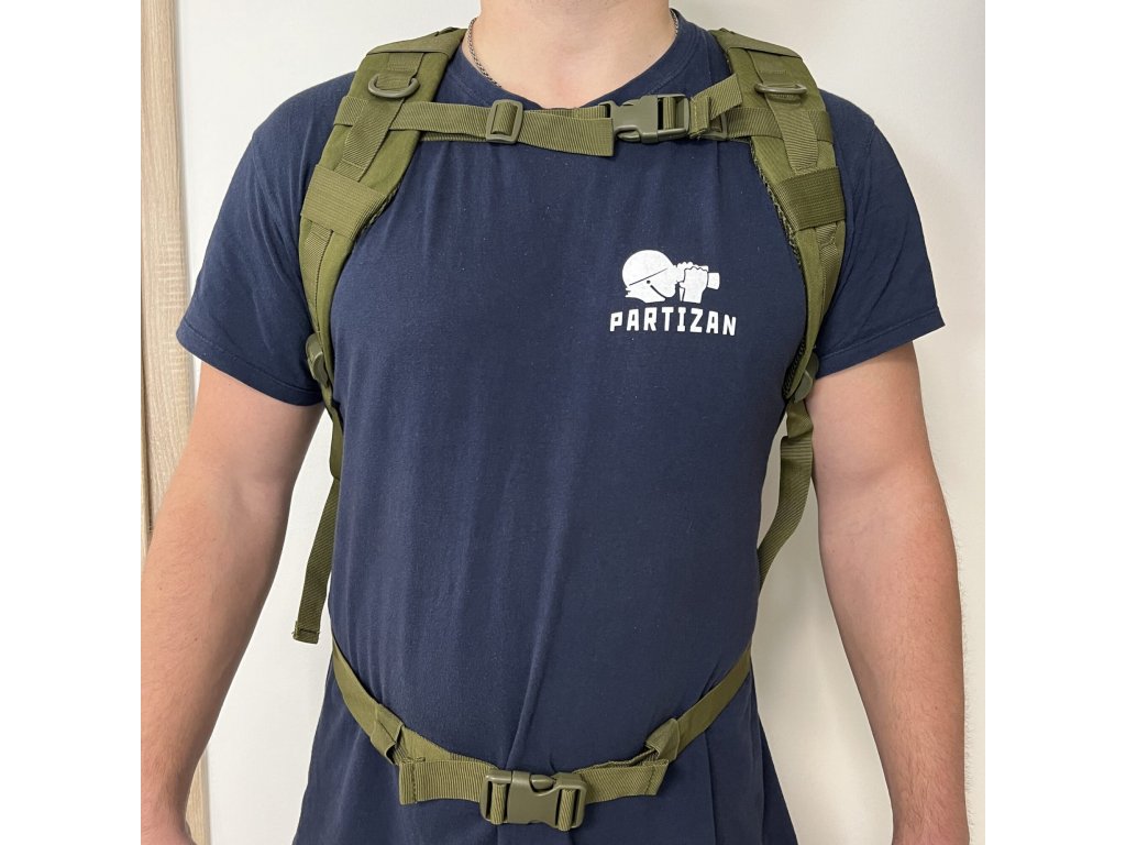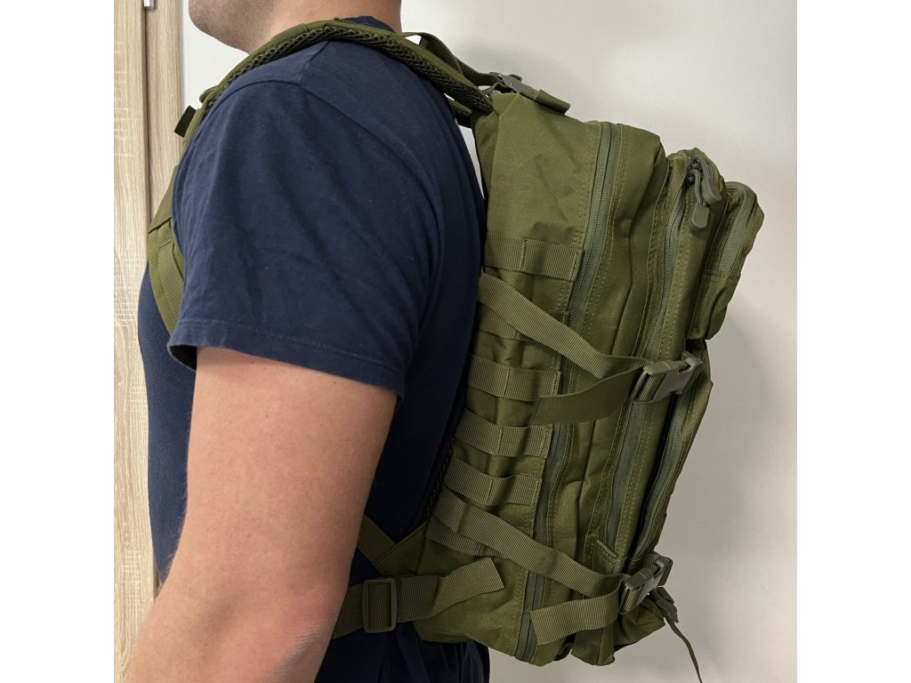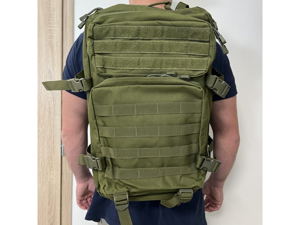 Taktischer Rucksack 40 L mit Molle-System (BPT9-40) Molle Olive Dieser taktische Rucksack mit 40 l Fassungsvermögen verfügt über ein Molle-System auf der Vorderseite. Der Rucksack hat außerdem zwei große Hauptfächer und zwei Außentaschen. Alle Fächer und Taschen sind mit robusten und zuverlässigen Reißverschlüssen ausgestattet. An der oberen Außentasche verfügt das Molle-System über einen Klettverschluss, an dem Sie einen Aufnäher oder eine zusätzliche kleine Tasche befestigen können. Die untere Außentasche verfügt ebenfalls über ein Molle-System. An der Oberseite des Rucksacks befindet sich eine Öffnung für das Trinksystem und auf der Rückseite ein verstecktes Klettfach. Die Rückseite des Rucksacks ist ergonomisch geformt und weich. Mit den seitlichen Kompressionsriemen lässt sich das Volumen des Rucksacks anpassen. Klassisches, zeitloses Design. Material: 600D Oxford Größe: 48 x 30 x 28 cm Gewicht: 1500 g Farbe: Oliv Lieferumfang: 1x Taktischer Rucksack 40 l mit Molle-System (BPT9-40) Molle Oliv
