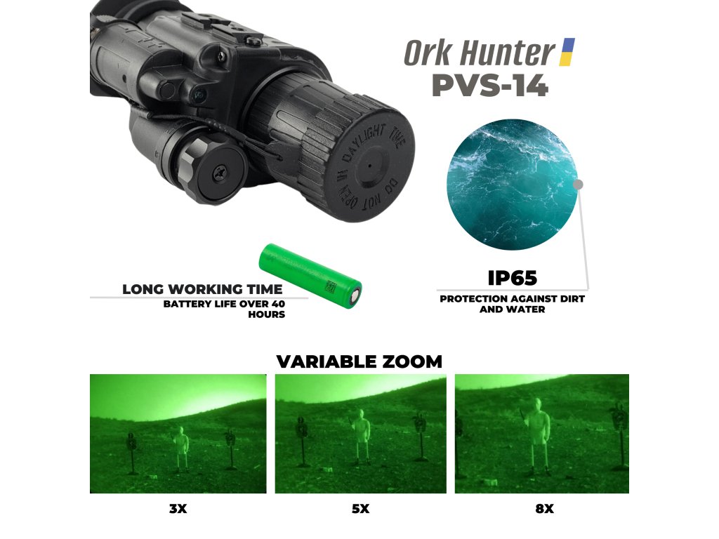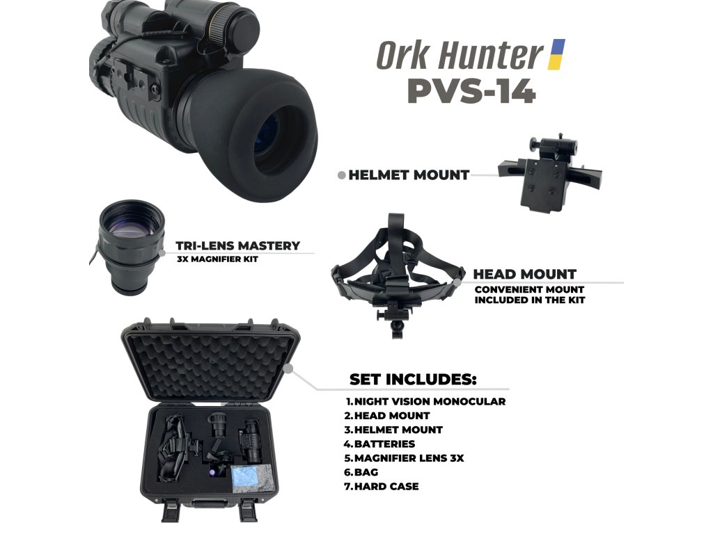 The Ork Hunter PVS-14 is a multifunctional night vision monocular with high technical characteristics. The model has a lightweight, compact, and durable housing. This monocular is perfectly protected against dust and moisture, is reliable, and easy to use. The Ork Hunter PVS-14 is equipped with a 2nd generation image intensifier and an IR illumination source. The multifunctionality of the monocular allows it to be used not only by hand, but also by attaching the device to the head or helmet. Package contents: Night vision monocular, head mount, helmet mount, batteries, 3x magnification lens, bag, hard case.Main features
