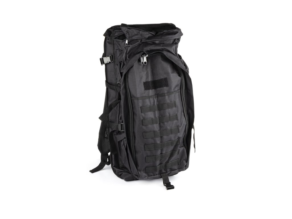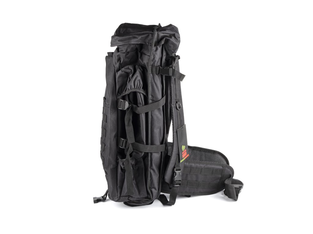 Tactical backpack 70 L with weapon cover (BPT8-70) Black Large tactical backpack that can fit everything you need for a few days. It has two side integrated bags and another large integrated bag on top. An important advantage of the model is a closed case for carrying weapons (automatic rifle, carbine, etc.). Because of this the weapon will be completely protected from adverse weather conditions, in addition, it will be very convenient to carry it. The comfortable and secure fastening of the straps ensures that the backpack will be securely fixed on the body and it will be comfortable to use even when you are running. The backpack holds its shape very well and ensures even weight distribution. Material: 600D Oxford Size: 94x44x22 cm. Weapon cover 115 cm Weight: 1800 g Package includes: 1 x Tactical backpack 70 L with weapon cover (BPT8-70) Black