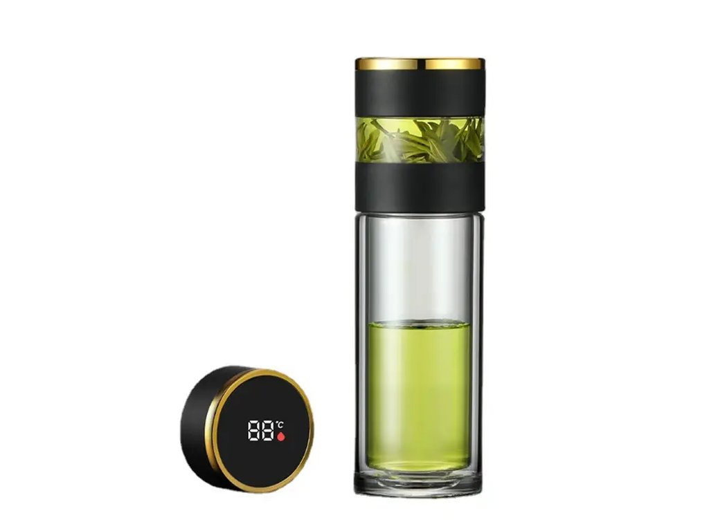 Tea Thermos Black Glass 250 The digital temperature indicator-equipped Tea Thermos is a convenient and functional vessel tailored for tea enthusiasts who are always on the move. Specifications: Size: 22x6.5cm Capacity: 250ml Cup body material: High borosilicate glass Plastic parts: food contact PP Weight: 0.5kg Color: Black Function: temperature display Separation of tea and water Package includes: 1x Tea Thermos Black Glass 250