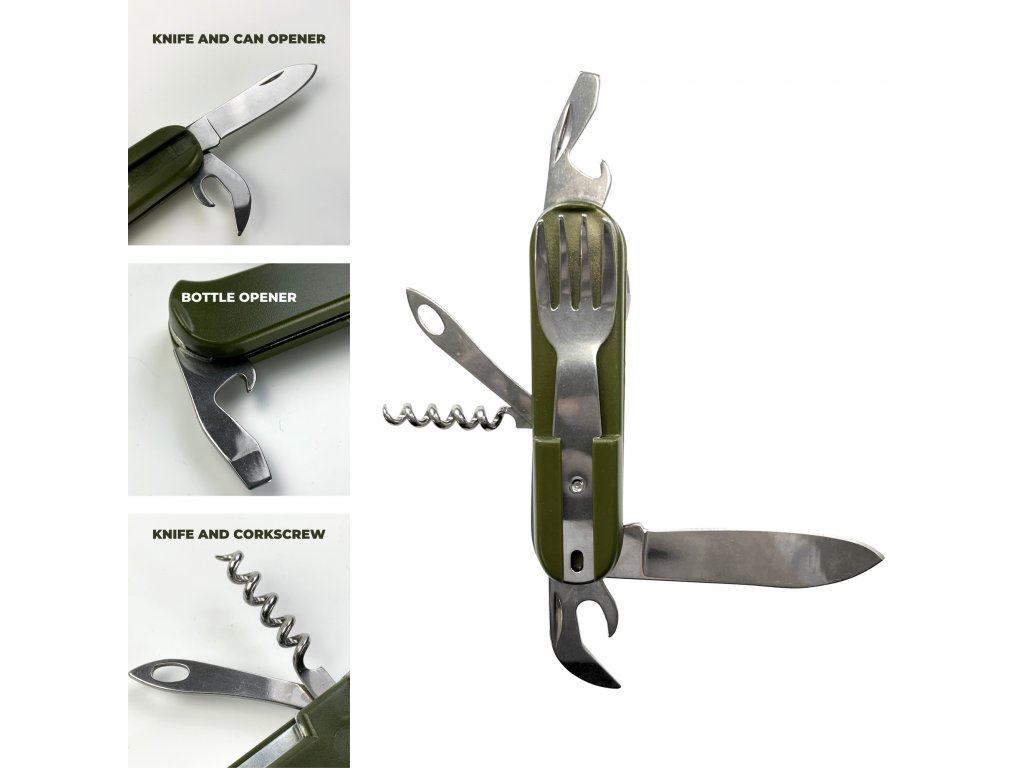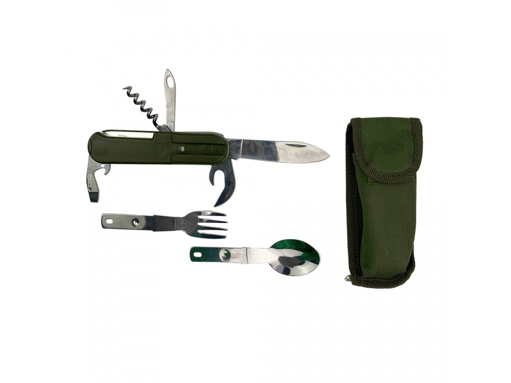 Partizan Tactical Food set 7in1 Kompaktní sada nerezových nástrojů — univerzální a prostorově úsporný multifunkční nástroj pro použití v terénu a venku. Kombinuje základní nástroje a otvíráky v jedné skládací sadě, což ji činí ideální pro kempování, turistiku nebo taktické situace. Vlastnosti: - Obsahuje lžíci, vidličku, nůž, vývrtku, otvírák na konzervy a otvírák na láhve - Skládací design pro minimální využití prostoru a snadnou přepravu - Vyrobeno z odolné nerezové oceli pro dlouhodobé použití - Lehké a praktické pro outdoorové dobrodružství Specifikace: Materiál: nerezová ocel Délka ve složeném stavu: 10,5 cm Délka v rozloženém stavu: 16 cm Barva: nerezová ocel Balení obsahuje: 1x skládací sada příborů (lžíce, vidlička, nůž, vývrtka, otvírák na konzervy, otvírák na láhve)