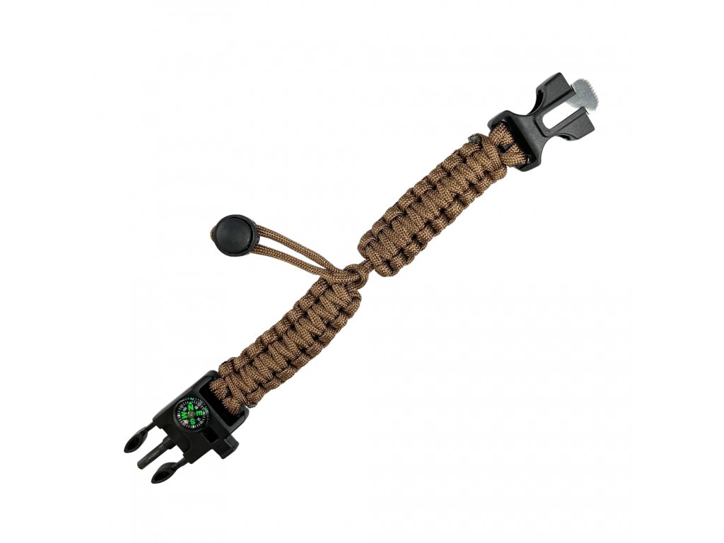 Náramek Paracord Partizan Tactical Coyote Multifunkční náramek Paracord — stylový a praktický outdoorový doplněk s vestavěným kompasem, sponou Fastex a nožem/křesadlem. V nouzových situacích lze náramek rozmotat a získat tak 3,2 m silného paracordu, který lze použít k postavení přístřešku, opravě vybavení nebo zajištění výstroje. Vlastnosti: - Stylový a odolný náramek pro každodenní nošení nebo outdoorové dobrodružství - Vestavěný kompas pro základní navigaci - Integrovaná spona Fastex pro bezpečné zapínání - Obsahuje malý nůž/křesadlo pro situace, kdy jde o přežití - Nastavitelná velikost zápěstí pro pohodlné nošení Určeno pro přežití a jako doplněk. Při manipulaci s nožem/křesadlem buďte opatrní; není určeno jako zařízení pro lezení nebo nošení břemen. Specifikace: Délka paracordu po rozmotání: 3,2 m Nastavitelná délka náramku: 230–285 mm Šířka: 33 mm Materiál: plast + paracord Barva: kojotí Balení obsahuje: 1x paracordový survival náramek s kompasem, sponou Fastex a nožem/křesadlem