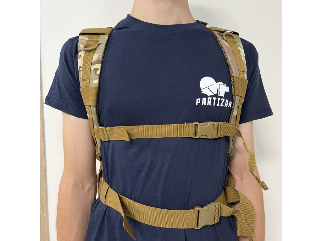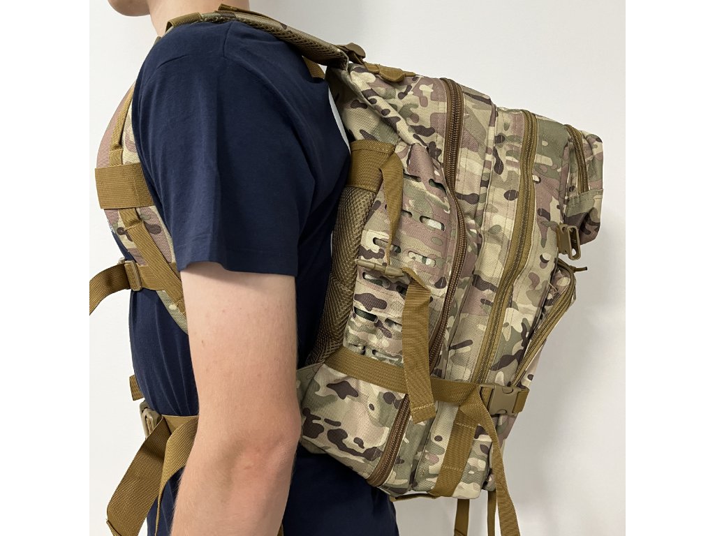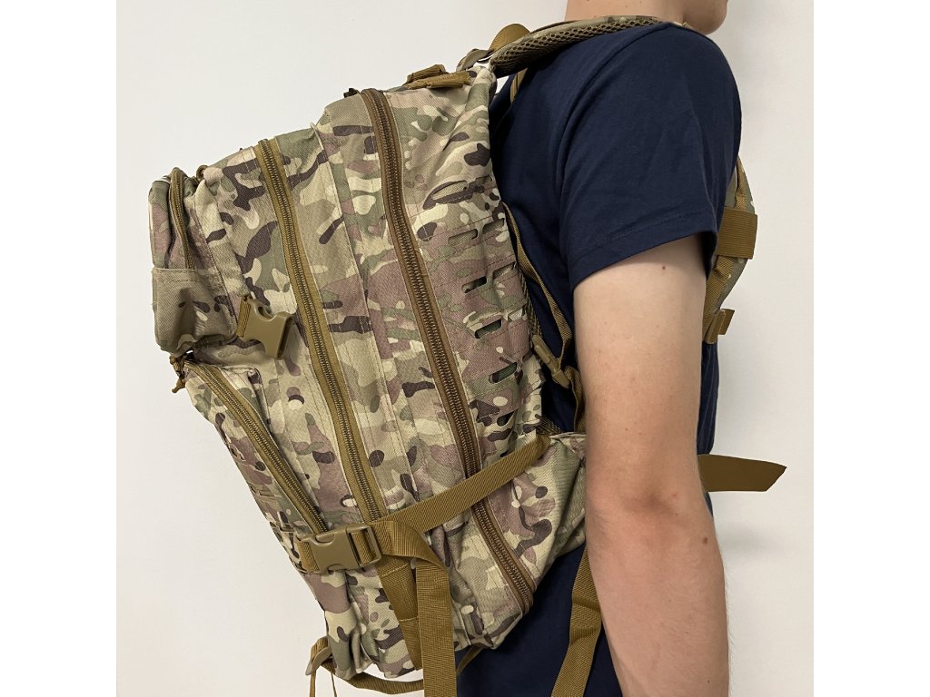 Taktický batoh 40 l se systémem Molle Laser Cut (BPT9-40) Multicam Tento taktický batoh o objemu 40 l má přední stranu v prémiovém provedení se systémem Molle Laser Cut. Batoh má také dvě velké hlavní přihrádky a dvě vnější kapsy. Všechny přihrádky a kapsy jsou vybaveny pevnými a spolehlivými zipy. Na horní vnější kapse má systém Molle Laser Cut suchý zip, na který můžete připevnit nášivku nebo další malou tašku. Spodní vnější kapsa má také systém Molle. V horní části batohu je otvor pro pitný systém a na zadní straně skrytá kapsa na suchý zip. Zadní část batohu je ergonomická a měkká. Boční kompresní popruhy lze použít k nastavení objemu batohu. Klasický nadčasový design. Materiál: 600D Oxford Rozměry: 48 x 30 x 28 cm Hmotnost: 1500 g Balení obsahuje: 1 x taktický batoh 40 l se systémem Molle Laser Cut (BPT9-40) Multicam