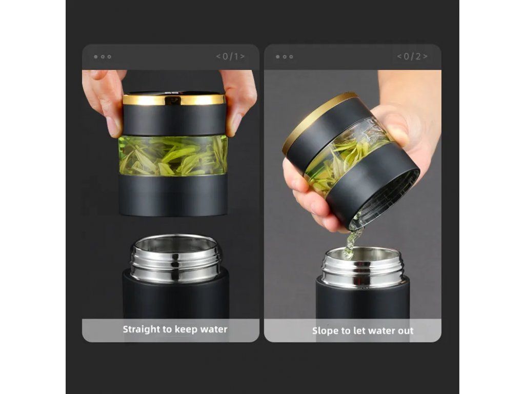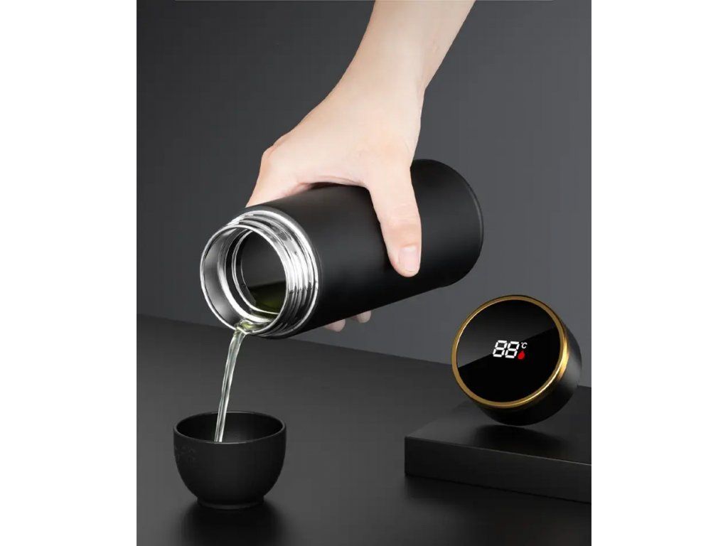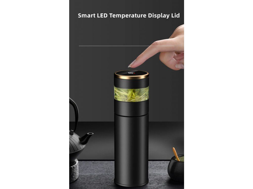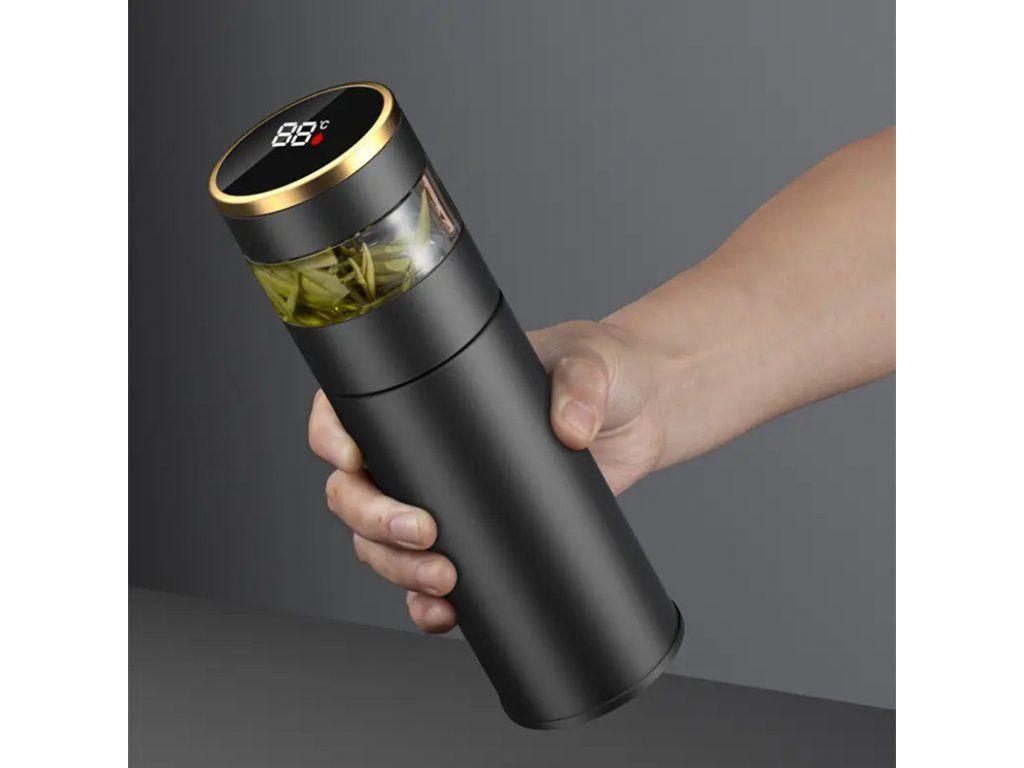 Čajová termoska černá vyhřívaná 450 Čajová termoska s digitálním ukazatelem teploty je praktická a účinná nádoba vyrobená speciálně pro milovníky čaje, kteří jsou často na cestách. Specifikace: Rozměry: 22 x 6,5 cm Objem: 450 ml Materiál: nerezová ocel Hmotnost: 0,36 kg Barva: černá Funkce: zobrazení teploty Oddělení čaje a vody Balení obsahuje: 1x Černá termoska na čaj s ohřevem 450 ml
